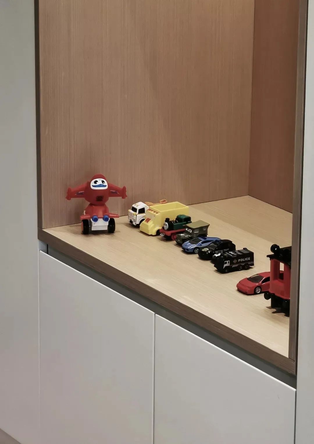 ▲儿童房内部定制收纳柜+空格柜设计,布置上儿童玩具车与火箭模型,使得空间充满童趣活力而有趣。