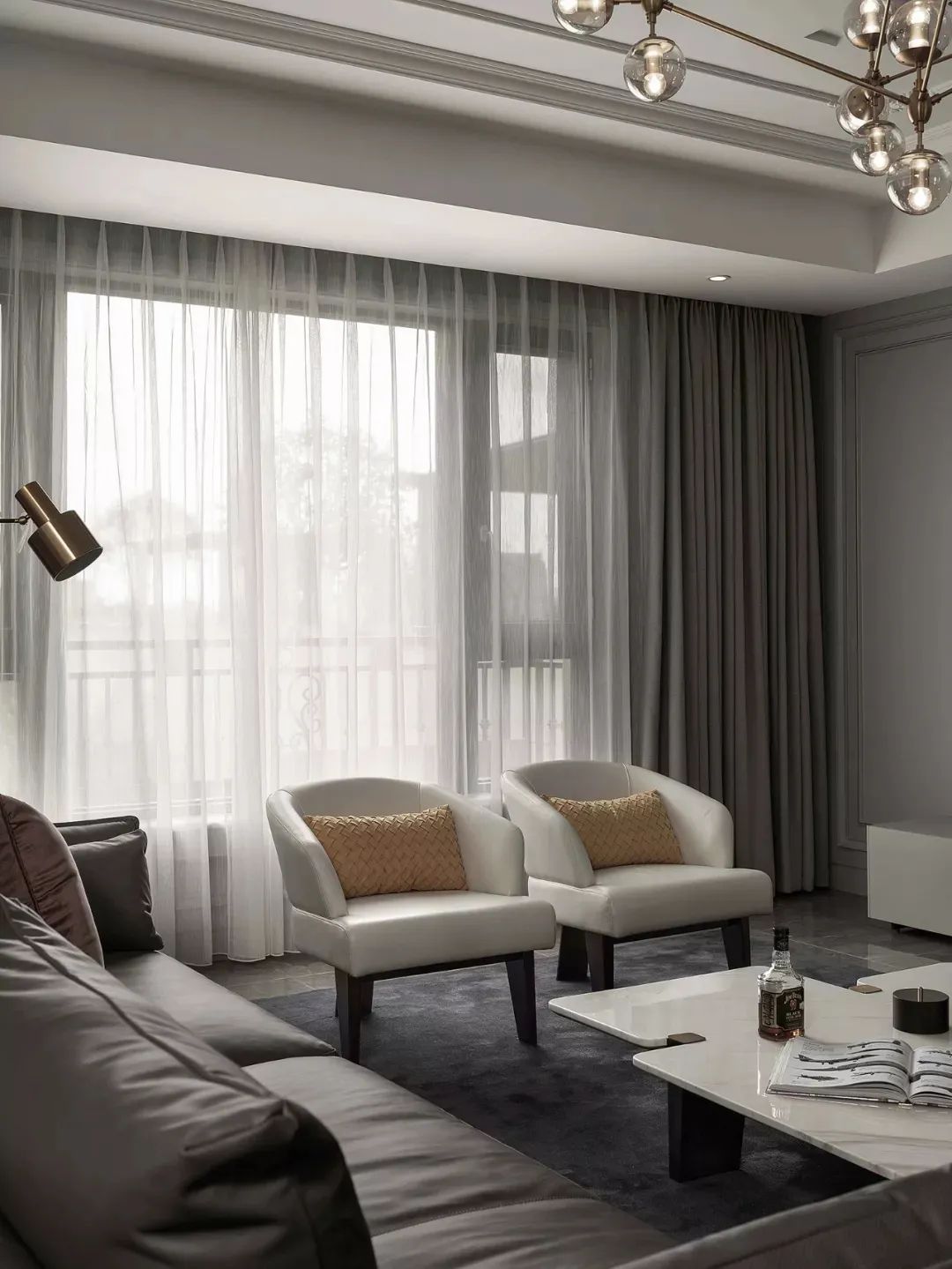 ▲地面铺设灰色地毯,布置灰色皮艺沙发、米白色的皮沙发椅、窗帘,使得客厅空间更加优雅现代而舒适大方。