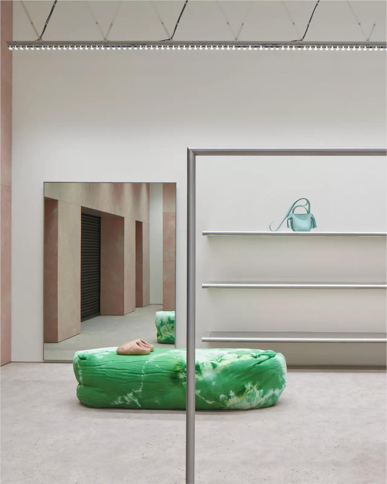 从远处看,与瑞典建筑师Christian Halleröd合作设计的精品店,以其干净和低调的立面包裹着从意大利进口的Rosa Perlino大理石而脱颖而出。在室内,这些材料装饰着柱子和墙壁部分,并与粉刷过的墙壁和混凝土地板搭配。家具和固定装置很少,只有光滑的金属衣架、架子和展示桌,以及头顶上的灯具,由法国设计师Benoît Lalloz设计。设计师马克斯·兰姆(Max Lamb)的扎染脚垫和陈列柜增添了一抹色彩,与艺术家丹尼尔·西尔弗(Daniel Silver)的人体模型相结合,为室内增添了艺术元素。公众号:米尚丽零售设计网