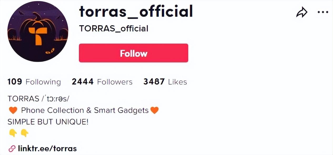 粉丝数量排行第六的是 TORRAS 图拉斯,账号名称 torras_official,粉丝数为 2444 名,获赞 3487 次。
