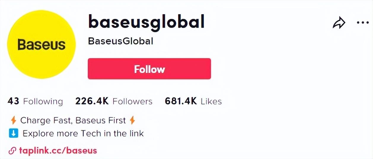粉丝数量排行第三的是 Baseus 倍思,账号名称 baseusglobal,共有 226.4K 粉丝数,获赞 681.4k 次。