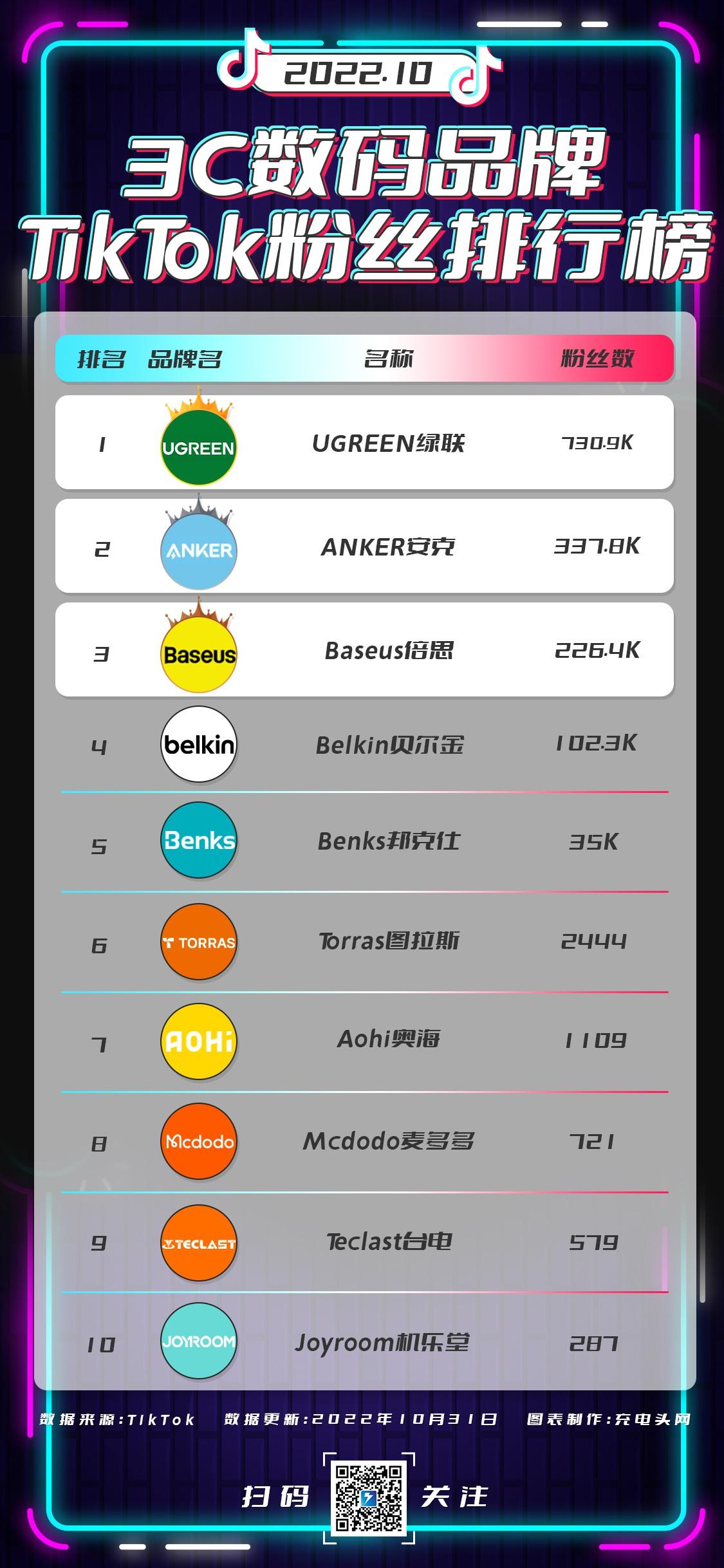 美国消费者购买 3C 数码配件除了量贩式大型超市外,也喜欢在亚马逊电商平台网购。近年来,短视频 APP TikTok 风靡,同样也席卷了美国地区,并开设了直播带货购物等功能,渐渐地众多电商开始进驻 TikTok 平台。充电头网整理了 TikTok 十家粉丝数量多的 3C 数码品牌,看看美国短视频平台电商是什么样的状况,数据统计于 2022 年 10 月 31 日。