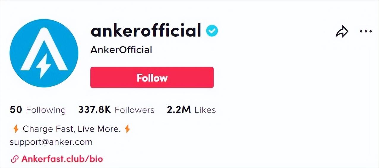 粉丝数量排行第二的是 ANKER 安克,账号名称 ankerofficial,共有 337.8K 粉丝数,获赞 2.2m 次。
