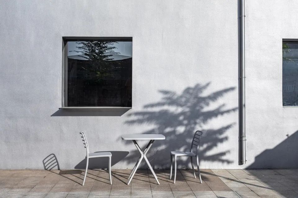 室外金属漆的运用让整个建筑显出雕塑感,迅速跳脱于周边的环境。散发着冷峻银色金属光泽的方形建筑,是小城杂乱背景前的一抹特别的颜色。