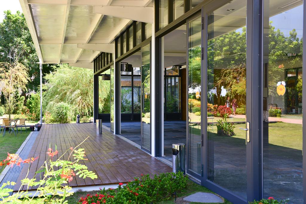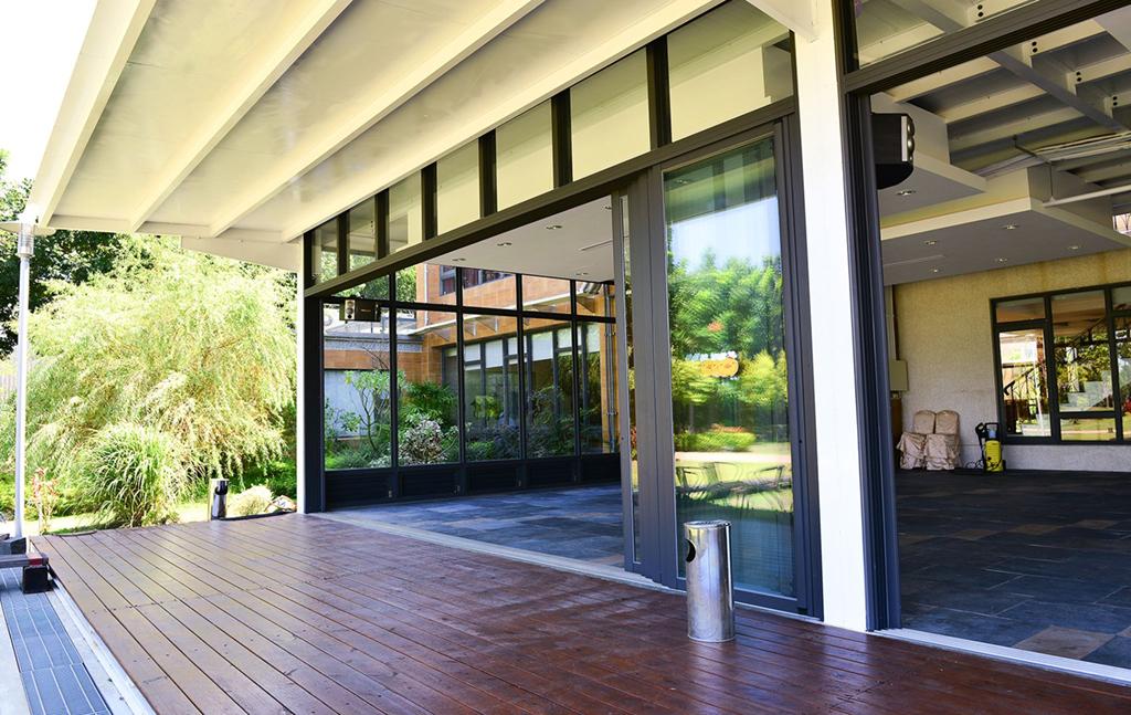 无障碍超大型落地窗的功能与好处,不仅使室内连接室外开放空间、视觉无障碍的让室内地平线无限延伸,引入更多自然光和空气流动、使空间使用弹性便利; 专利地平轨设计可以用预埋式工法使其与地面近乎一致,或是直接安装于地面只有1.5厘米,符合无障碍设施规范中高低差在0.5厘米至3厘米内的设计,使孩童、老人、身障者都能轻松自在地通过,不再被阻碍绊倒。市面上的轮椅尺寸静止尺寸为宽75公分、长120公分,无障碍通路中净宽小为90公分,回转直径为150公分。单扇推门对轮椅使用者较为辛苦,需留设适当之操作空间,而拉门较方便轮椅使用者进出。窗扇因加装高载重可调式双培林轮设计、采用工业工程专用不腐蚀塑钢材质,使窗扇轻松开阖。分隔室内室外只需轻轻一推,立即形成抗噪隔间,调整窗扇紧密闭合度,提升水、气密性。适合用于阳台对外窗、大门庭院。