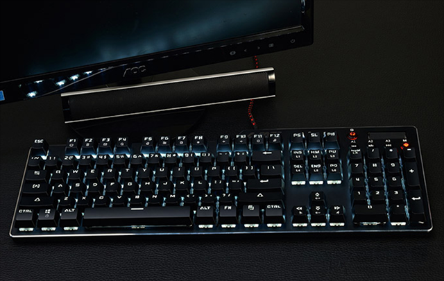 G413的整体布局采用悬浮式按键设计,面板采用了铝合金材质,经过阳极氧化与拉丝,风格较为硬朗。与G810一样,G413并没有采用Cherry轴的方案,而是采用了自家的Romer-G机械轴,官方称与传统CHERRY(樱桃)轴相比触发速度快25%,可承受7000万次敲击,支持26键无冲,更加适用于游戏用户。总体来说,Romer-G在按压手感上阻力克数近似于Cherry MX茶轴,行程短反馈低,比较强调速度。