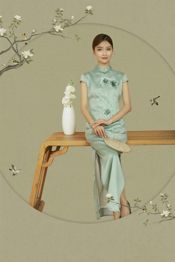 这件旗袍清新雅致,再加上宋轶手上提个金色的小拎包。两者结合展现出那个年代的时尚感,高贵优雅。