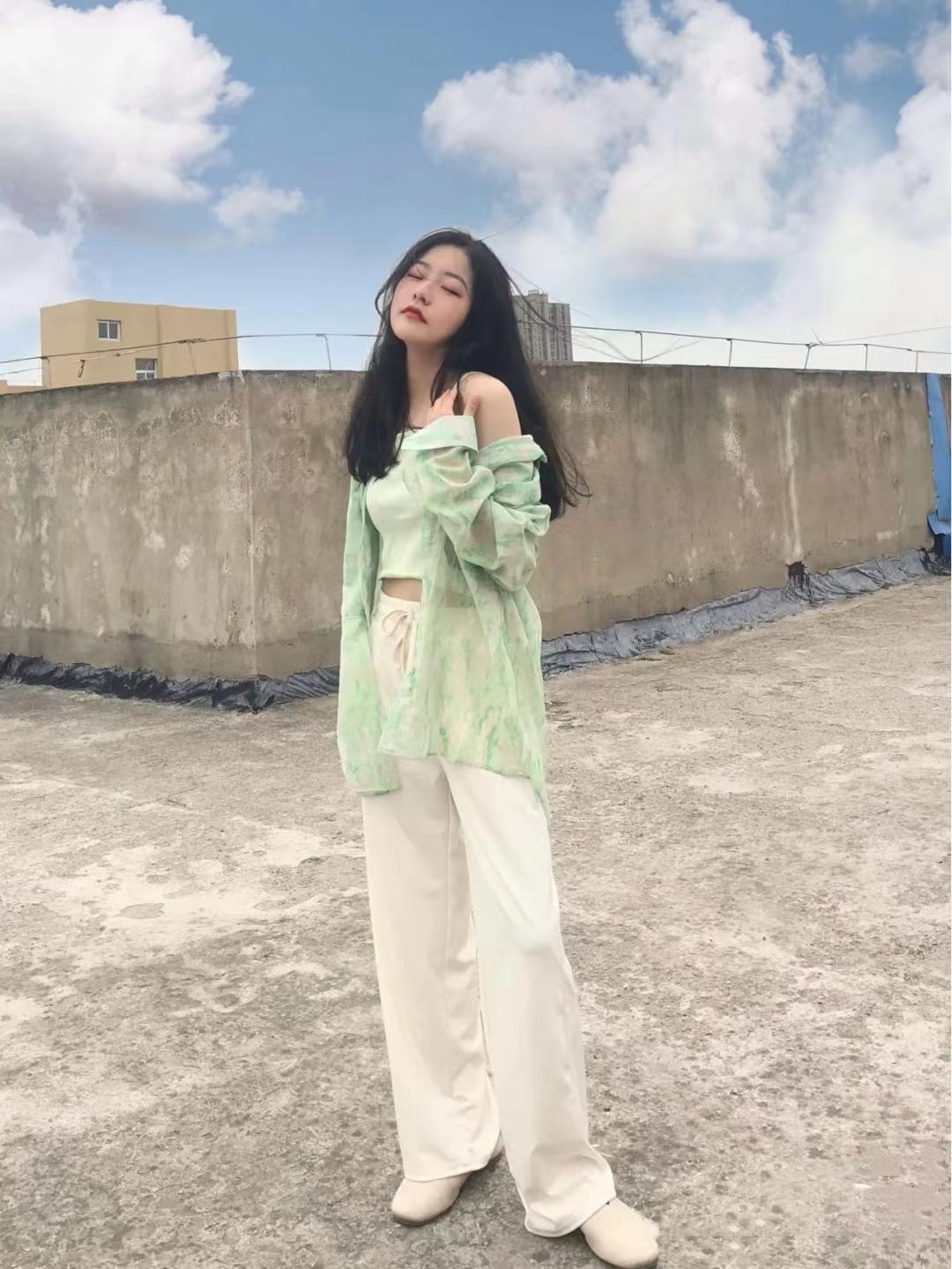 宽松的阔腿长裤也有各种不同的分类,像这种亮色系的牛仔阔腿长裤,就是一种散发着青春活力的穿搭。清爽的绿色系,给人心旷神怡的美好。及地的裤腿,高挑的腰身,优化出的三七比例。搭配了清清爽爽的白色T恤,与利落的小白鞋,透着青春的活力,整个人的个子也显得高挑起来。