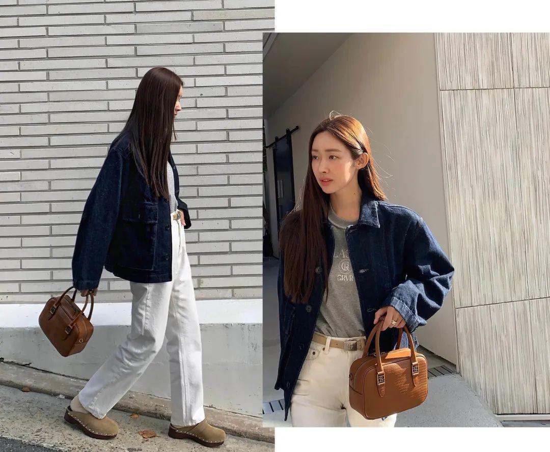 夹克版型的牛仔布外套有点“复古姥爷风”,和麂皮类的小物很搭。