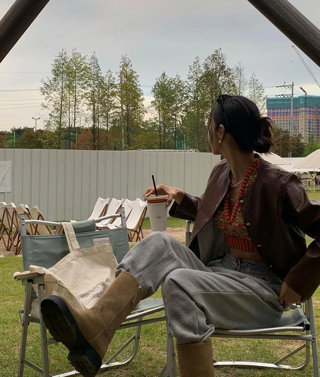 IU这两天也穿着皮衣去旅行了,事实证明和普通的T恤针织卫衣也能很时髦。