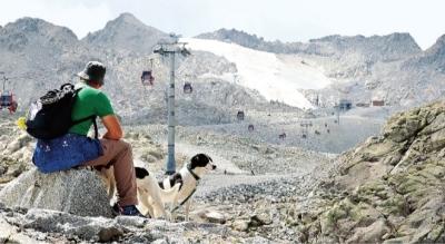 为减缓冰川融化速度,普雷塞纳冰川被盖上白色“床单”。图为7月27日,在意大利布雷西亚,游客坐在被白色“床单”覆盖的普雷塞纳冰川前。新华社发