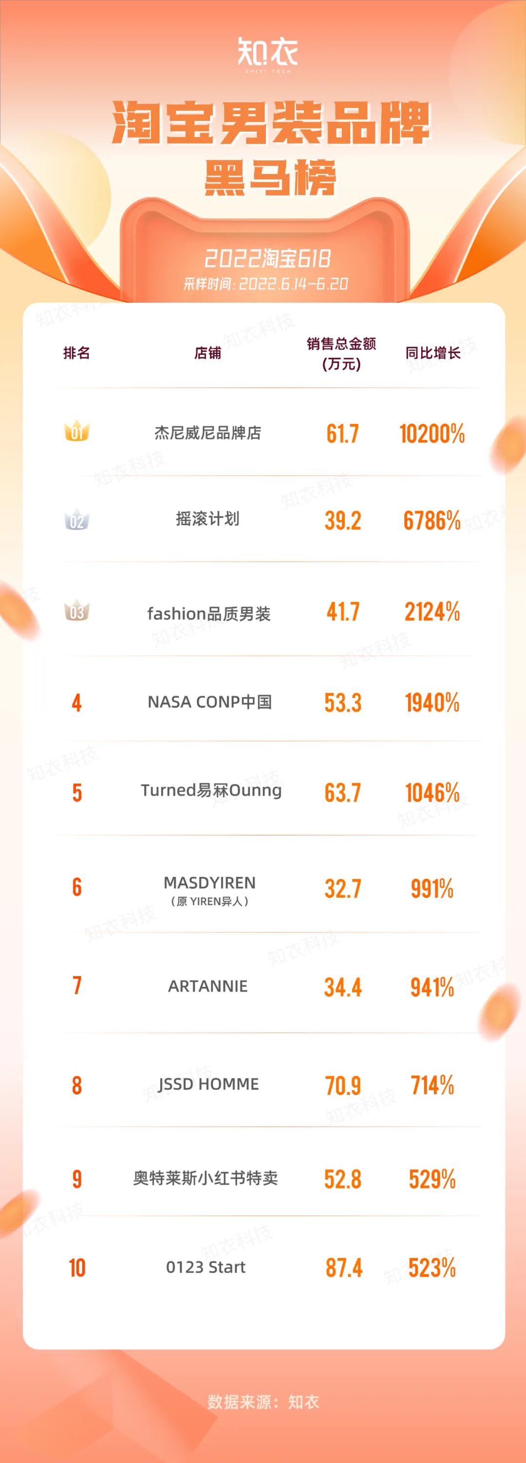 2.「 杰尼威尼品牌店 」是淘宝男装黑马榜中一家同比增长超10000%的店铺,远高于其他9家。