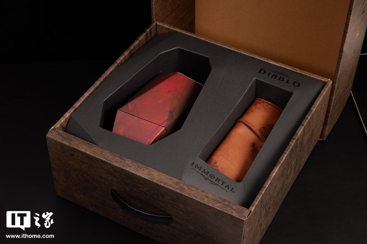 打开魔盒,呈现在面前的是如暗红血色宝石般的世界之石,以及羊皮卷轴质感的庇护之地世界图,并且周围的保护纸壳上同样印着暗黑破坏神不朽的艺术风格 Logo。
