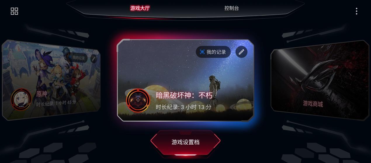 系统与配件ROG 游戏手机在手游核心体验上一直都是下功夫的,尤其是针对玩家设计的智控中心和个性化功能。打开手机自带的智控中心,不仅有炫酷的进入动画,还针对横屏和竖屏两个方向适配了两套 UI,翻转手机时也做了专门的切换动画,游戏大厅(游戏列表)和控制台也进行了分开呈现,一目了然。