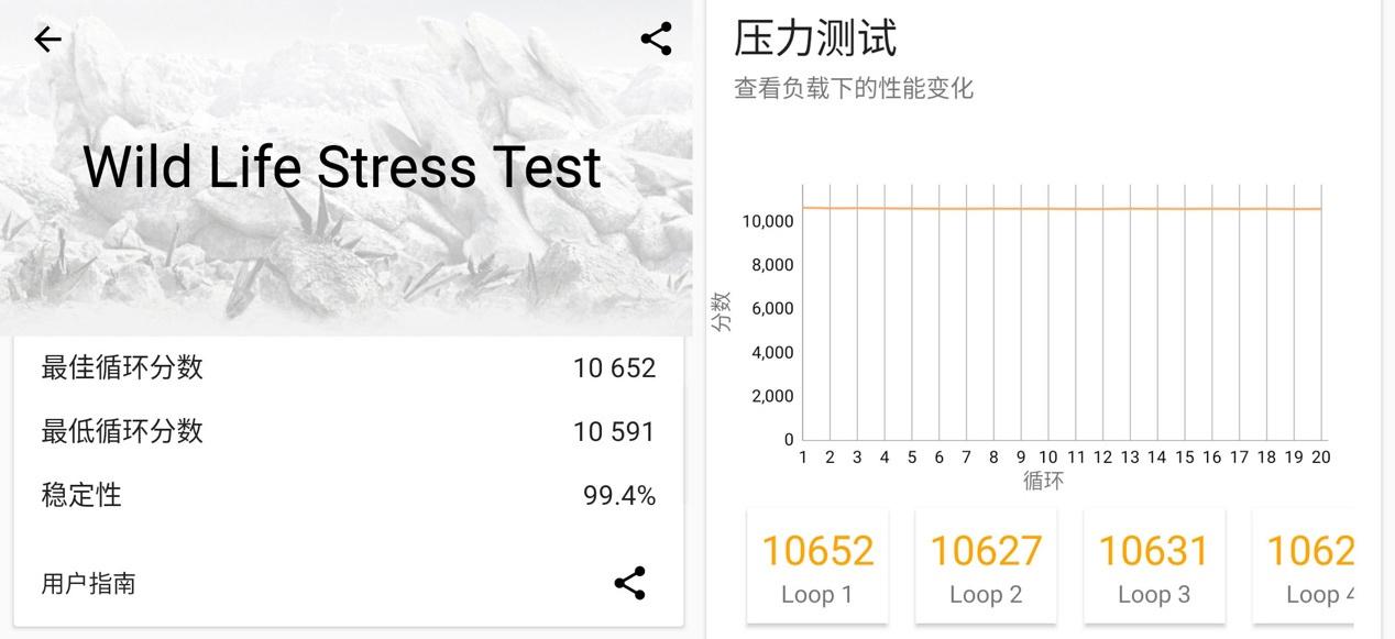 骁龙 8+ Gen1 作为高通今年的工艺改良款旗舰 SoC,制程工艺由三星 4nm 换成了台积电 4nm,同时大、中、小核的频率进一步提升,它的性能表现大家都了解,所有理论测试我只说一点,我们用 3D Mark 的 Wild Life Stress Test 对 ROG6 进行 20 轮压力测试,来验证下它的稳定性表现。可以看到终稳定性为 99.4%,跑分都在 1W+,跑分曲线直接成一条直线,挑不出任何毛病。