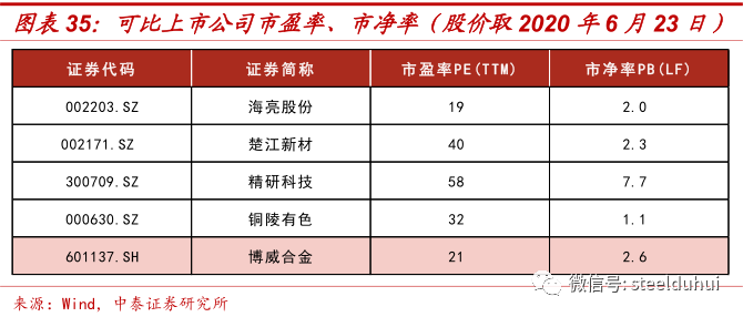 相对估值:我们选取相关铜合金加工企业,按照2020年6月23日收盘数据,对比上市公司市盈率、市净率情况如下表,博威合金目前估值处于行业偏低水平,考虑其未来成长性,预计2020-2022年PE为18X/14X/12X。