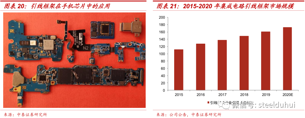 引线框架:引线框架属于半导体/微电子封装专用材料,即将生产出来的芯片封装起来,为芯片正常工作提供能量及散热和保护功能,而高传导、抗高温软化系列铜合金材料是集成电路引线框架的主要原材料。当前电子信息产品向轻薄化、高速化及智能化发展,对应集成电路向超大规模方向发展,引线框架则在保持强度和导电性的同时厚度需至少减半,高端铜合金材料市场前景更为广阔。根据公司公告,2015年至2017年我国芯片产业所用的集成电路引线框架的产值分别为114.4亿元、127.2亿元、137.6亿元,预计2018至2020年芯片用集成电路引线框架市场将呈现年复合约8%的速率增长,2020年市场规模将达到172.6亿元。