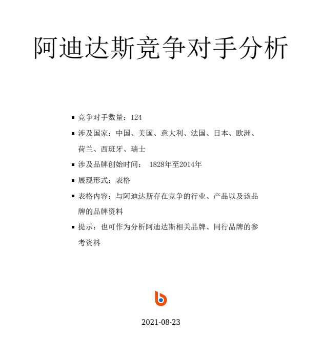 竞争对手数量:124涉及:中国、美国、意大利、法国、日本、欧洲、荷兰、西班牙、瑞士涉及品牌创始时间: 1828年至2014年展现形式:表格表格内容:与阿迪达斯存在竞争的行业、产品以及该品牌的品牌资料提示:也可作为分析阿迪达斯相关品牌、同行品牌的参考资料PDF文档获取方法:关注并私信可获取。