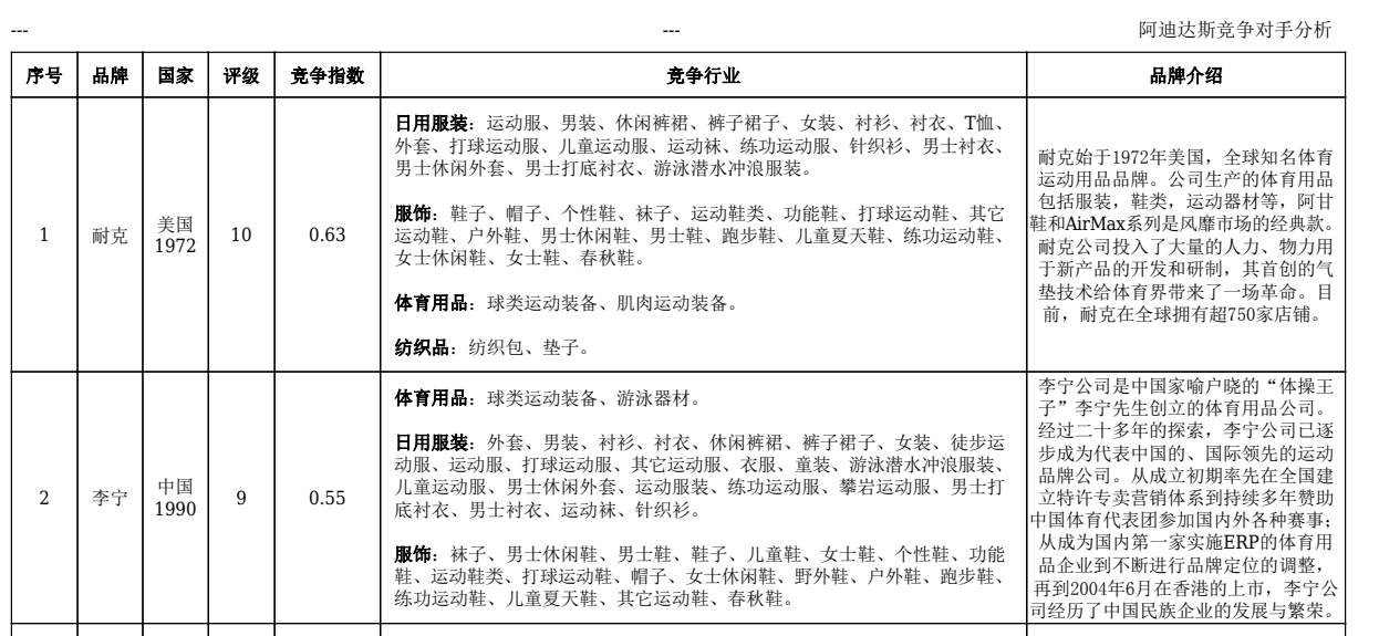 内容举例:列举耐克与阿迪达斯存在竞争关系的行业