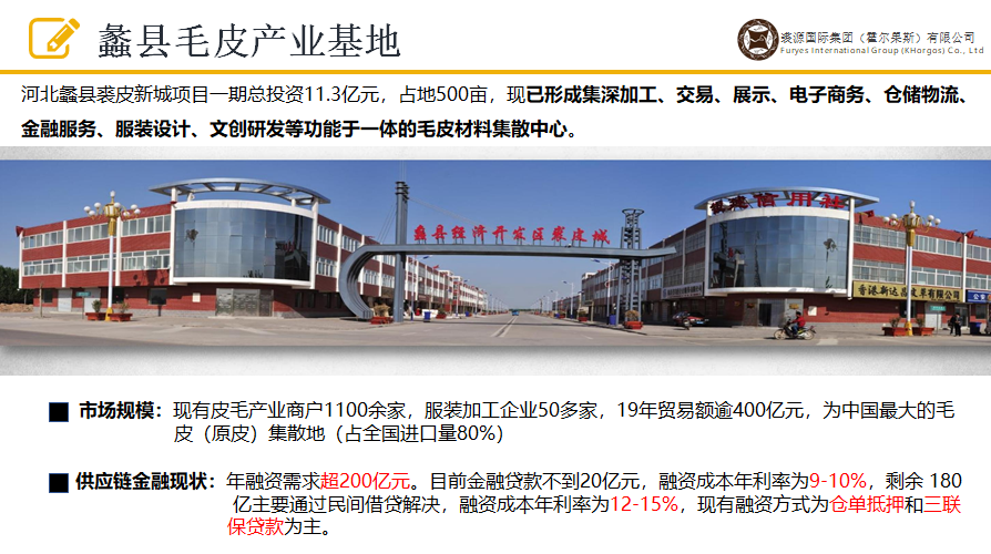 通过与霍尔果斯经济开发区管理委员会合作,围绕蠡县“裘皮新城—中亚皮毛交易中心—霍尔果斯国际毛皮产业园”的“一个中心,两个基地”,打造霍尔果斯“国际毛皮全产业链发展项目”。
