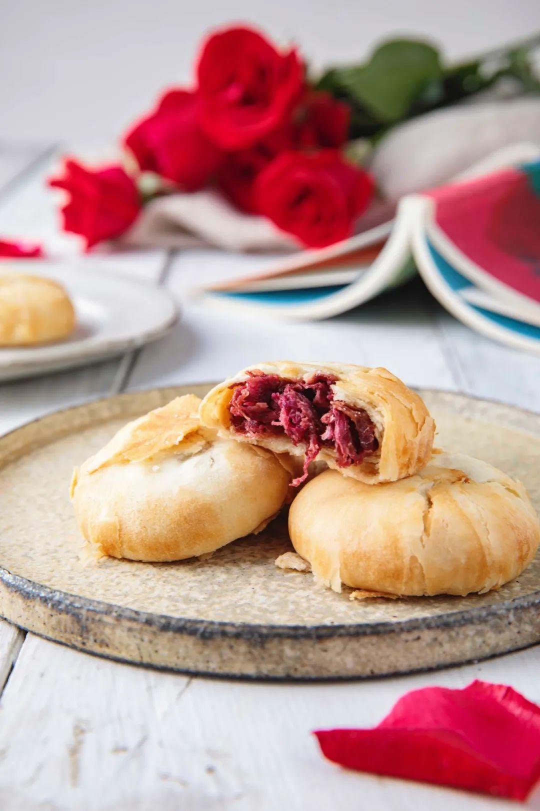 自带浪漫风情的鲜花饼,处理过的新鲜花瓣全都包入内心。一入口,强烈的玫瑰花味掠夺了口腔,沁人的花香在嘴里萦绕,仿佛整个人浸泡在玫瑰浴中,香而不腻。