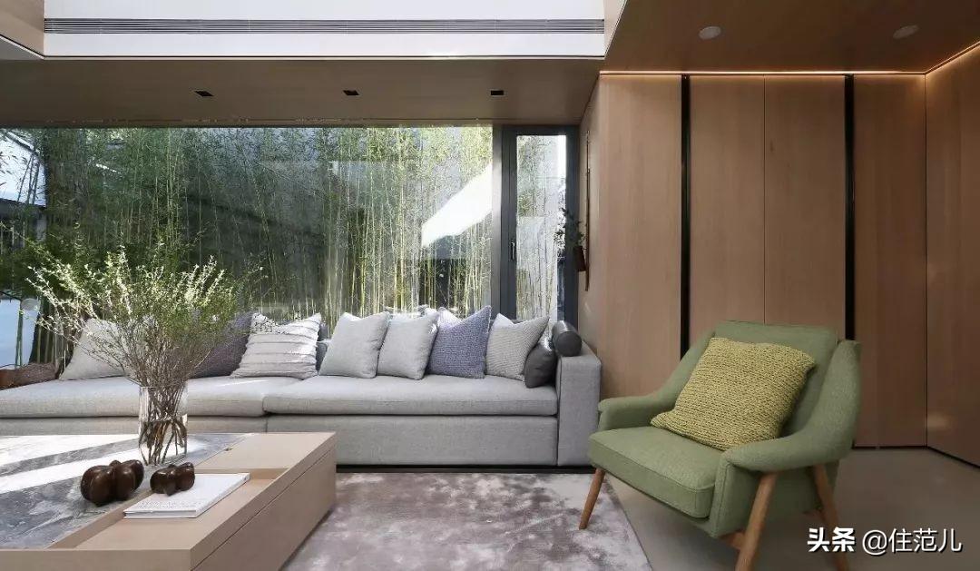 阳光洒进大落地窗,在客厅尽享庭院美景;