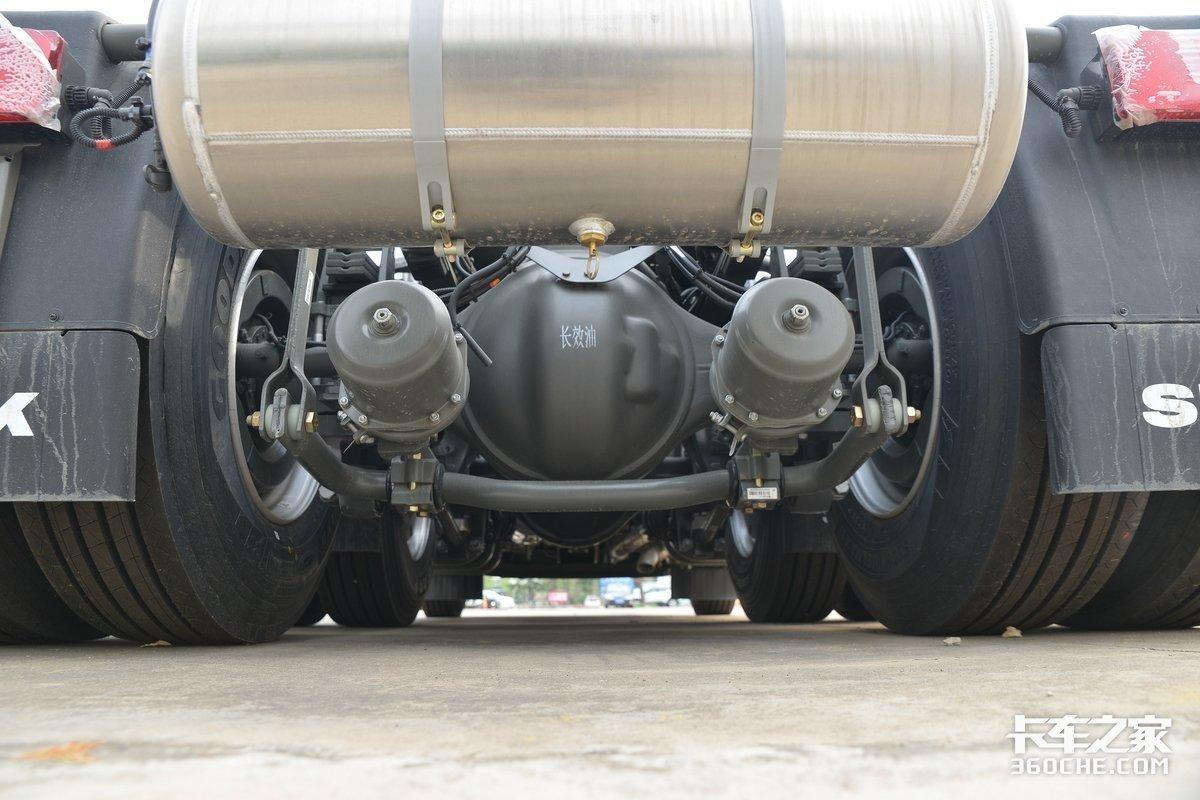在底盘方面,实拍车型采用前后钢板悬架设计,后桥可选空气悬架,后桥为MCY12BGS的自调臂双后桥,速比为3.08。同时为了节约底盘空间,提升油箱容积,C9H将储气罐放置在车架内侧和大梁尾部,并且前桥标配盘式制动器。