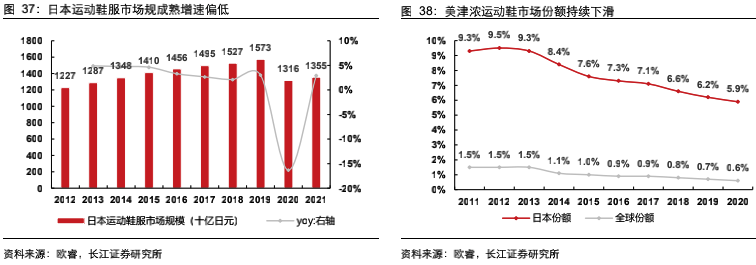 从市场竞争格局来看,美津浓在日本合国际市场份额均呈现持续下滑态势。美津浓运动鞋服 2021 年在日本市场份额为 9%排名第三,高于亚瑟士但低于国际运动巨头 Adidas与 Nike,且在及日本市场份额持续下滑。