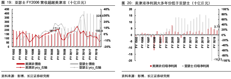 亚瑟士于 2005 年左右超越美津浓从业绩对比来看,亚瑟士业绩不断提升,FY2006 营收达到 1710 亿日元高于美津浓 1617亿日元,此后差距渐大,归母净利润也大幅超越美津浓(2018 年业务组织改革与 2020年疫情业绩有所下滑)。