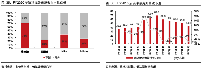 市场端:化进展不畅,海外市场销售萎缩从市场端来看,美津浓的化战略成颇微,海外市场销售有所下滑。从财务表现来看,美津浓本国营收占比较高,仍聚焦于本土市场;自美津浓 1979 年开设美国分公司拓展海外市场,但其化进展不畅,分析可能主要为以下原因: