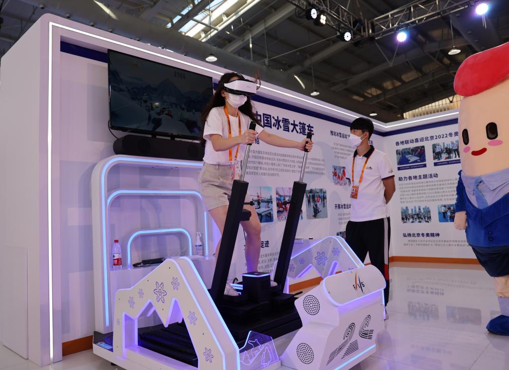 9月1日,一名女士在服贸会体育服务专题展区体验虚拟滑雪设备。新华社记者戚晓毅摄