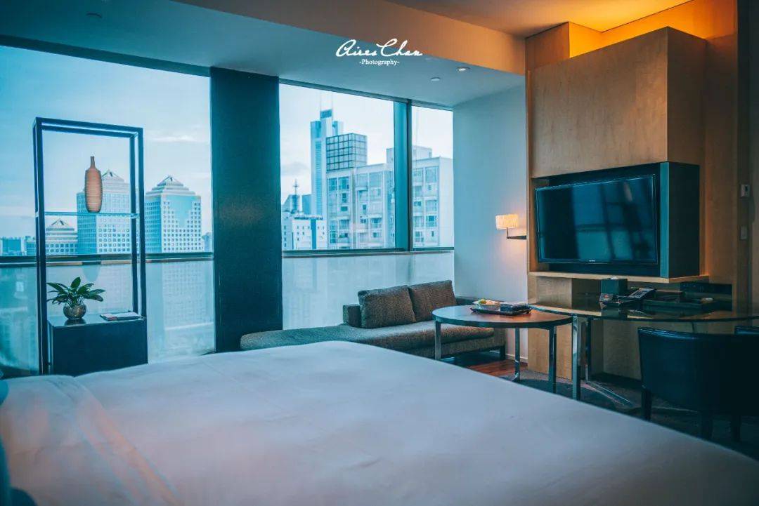 行政套房的卧室区域呈三角形,斜边一侧是整面的落地玻璃,可以看到窗外的城市景观和楼下的车水马龙。在起居室、卧室、步入式衣橱、化妆间和浴室之外,还有一个相对宽敞的独立小书房「藏」在卧室一旁,第一次进来会有一种「柳暗花明」的感觉。