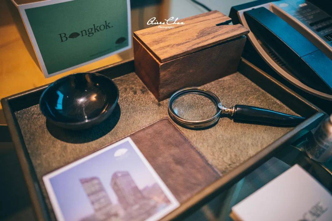 起居室的mini吧台是一个中式柜子,巧妙的与居家氛围相融合,一般较为常见的方形办公桌也被替换成成了玻璃圆桌,桌面上摆放的放大镜、钢笔等等也是偏居家的装饰物,欢迎甜点则是用一套功夫茶具来装着巧克力,中西融合的意味明确。