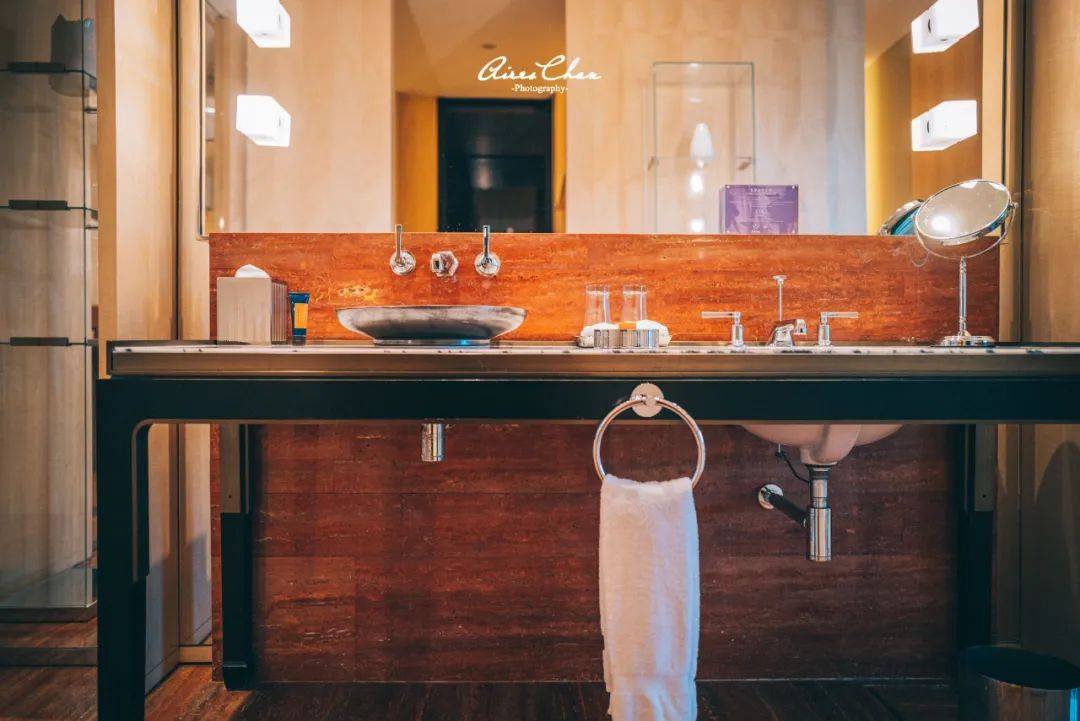 套房的备品用的是源自法国的香薰品牌diptyque蒂普提克,这在酒店行业里并不算常见,其他房型一般用的是大瓶装的Atelier Cologne法国欧珑。黄铜包边的雪花白大理石上有两个风格迥然不同的盥洗盆,一个铜盆一个瓷盆,一个凸起来一个凹下去,也挺有趣的。