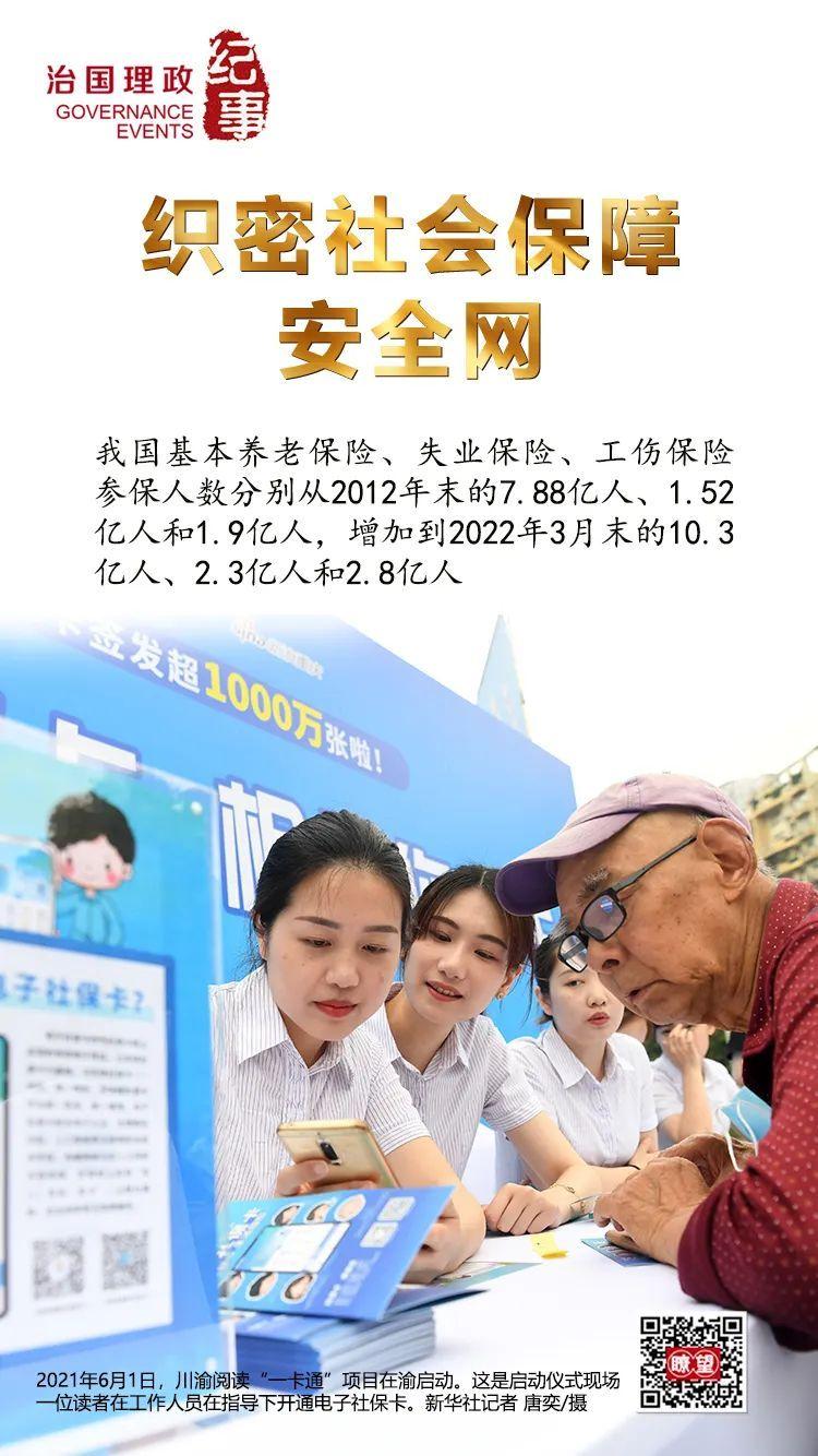 我国基本养老保险、失业保险、工伤保险参保人数分别从2012年末的7.88亿人、1.52亿人和1.9亿人,增加到2022年3月末的10.3亿人、2.3亿人和2.8亿人。近1亿贫困人口实现基本医疗有保障,6098万建档立卡贫困人口参加基本养老保险,参保率稳定在99.99%以上,基本实现应保尽保。