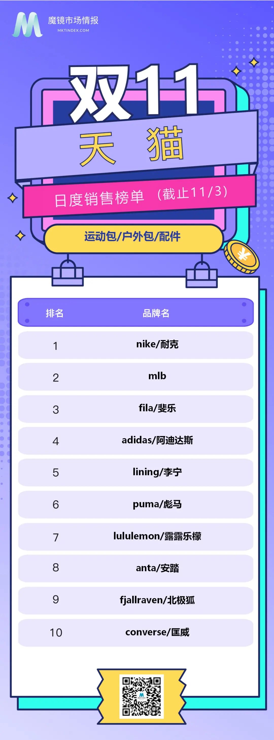 今天,魔镜市场情报为大家盘点一下运动户外、服饰鞋包行业中,天猫平台截至11月3日含预售的累计销售额品牌排行。