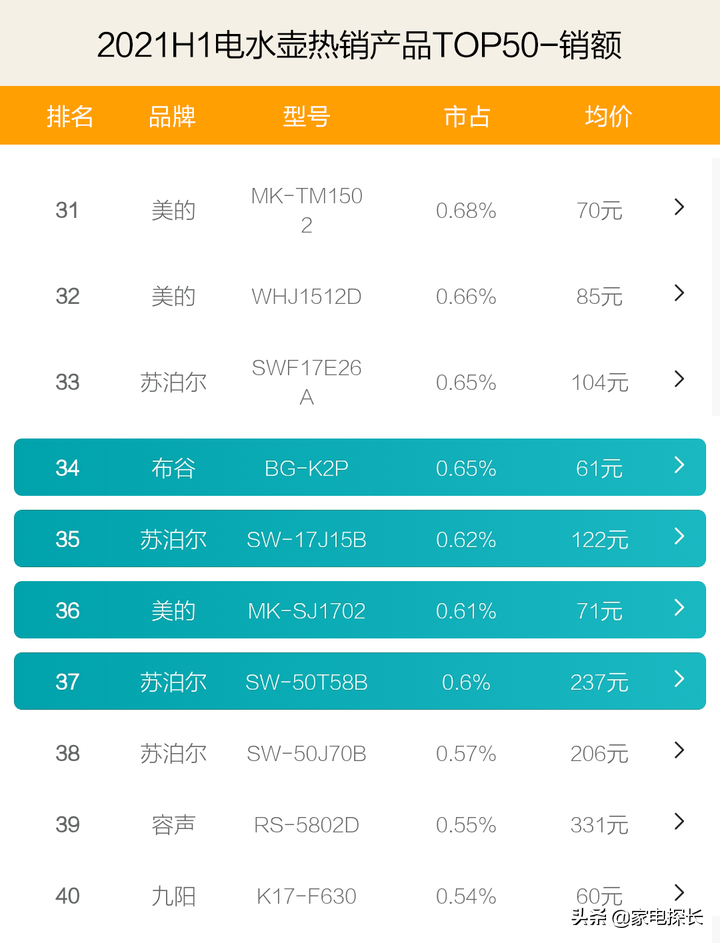 2021年上半年,电热水壶TOP50热销机型,销售额榜单中,美的上榜16个、苏泊尔14个、九阳5个、小米5个、小熊3个,其它品牌7个。