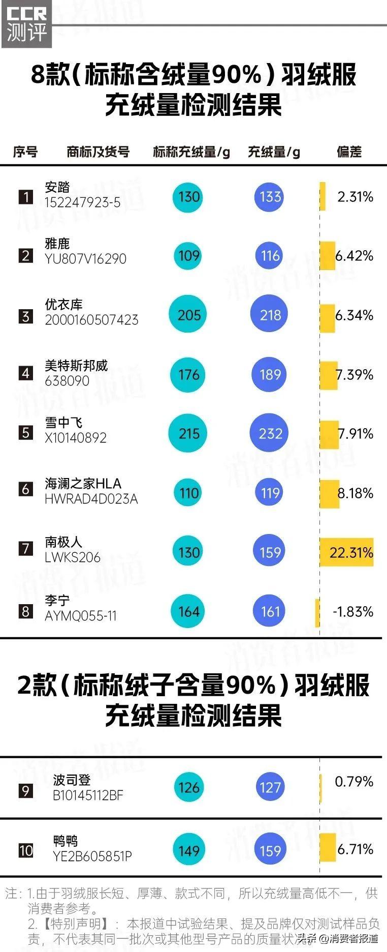 2022年12月,《消费者报道》随机选购了市面上较热销的10款羽绒服进行多项测试,品牌包括优衣库、安踏、李宁、美特斯邦威、海澜之家HLA、雪中飞、南极人、雅鹿、波司登、鸭鸭。