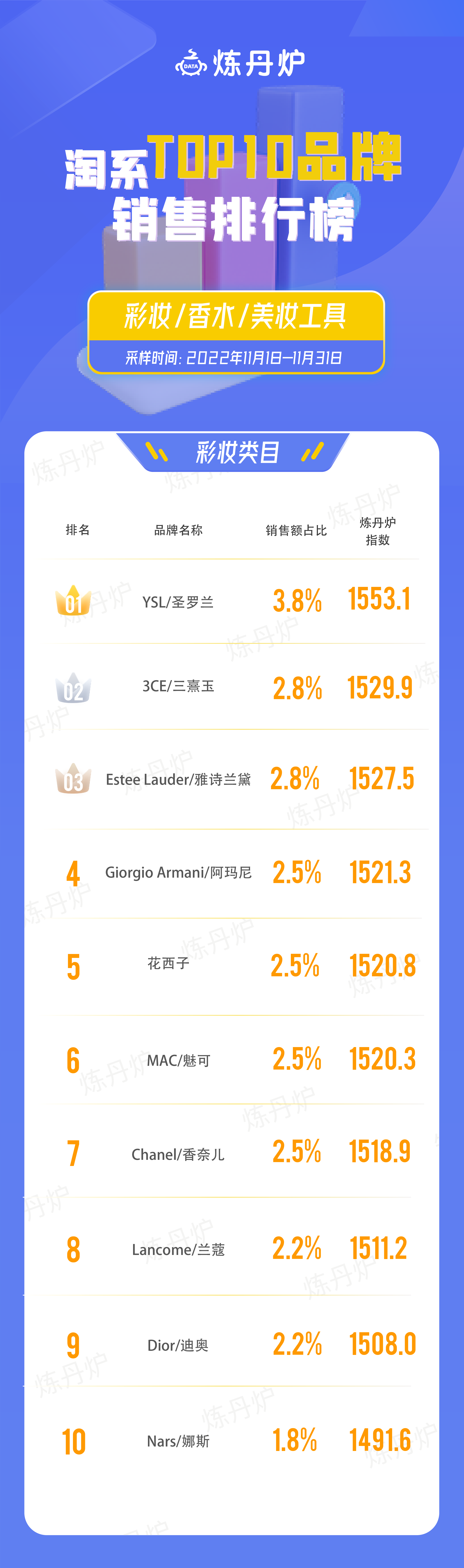 榜单根据炼丹炉数据自研算法,结合相关销售数据进行加权,以行业实际为基础,形成热度分、行为事件分、衰减因子,得出「炼丹炉指数」并形成品牌排名。