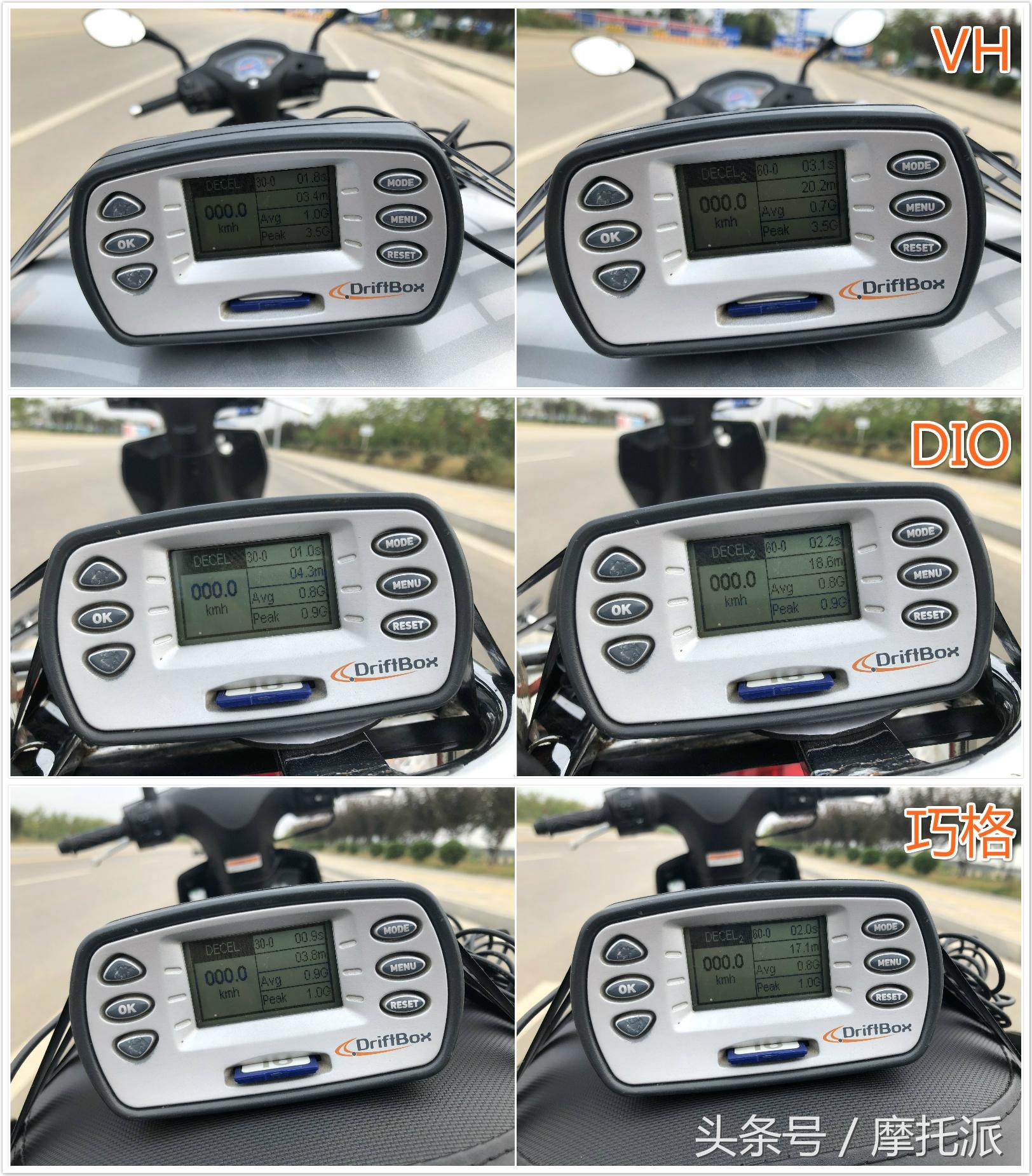 VH因为是新车,制动器还未经过适度的磨合,且质量惯性也较大,所以制动成绩相较于其他两车稍弱一点;好在它的轮胎抓地力不错,在制动距离方面找回了一些面子。DIO和巧格均取得了不错的制动数据,其中巧格的制动表现更好,这也说明了单卡钳并未见得比双卡钳差,而质量惯性也是决定制动果的重要依据。