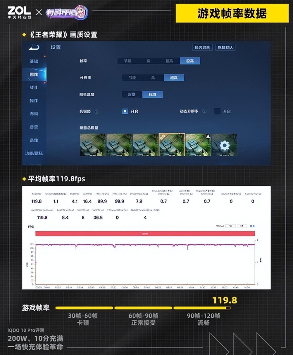 首先是《荣耀》,这款游戏支持多种帧率模式选择,笔者这里主要体验了120fps模式。画质特全开下,从跑分软件PerfDog记录到的数据来看,iQOO 10 Pro在15分钟《荣耀》测试中平均帧率达到了119.8fps,整体表现比较平稳,并没有出现较为的波动情况。