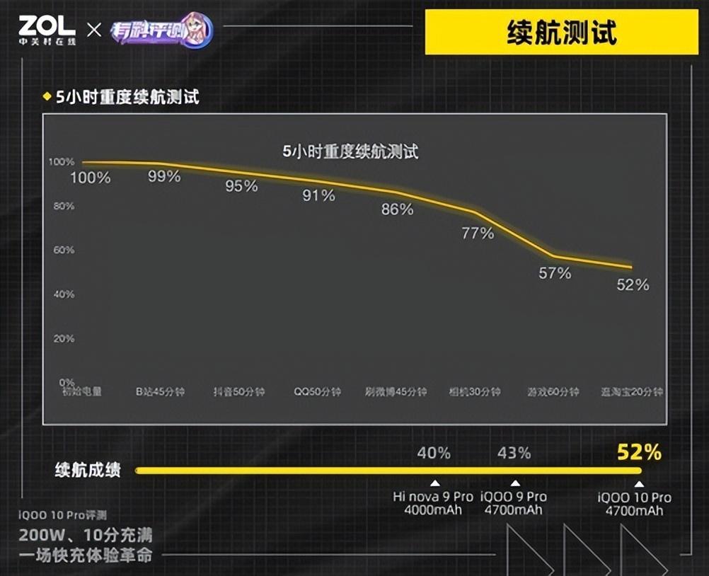 除了快充之外,手机的续航能力同样重要。为了更直观感受iQOO 10 Pro的续航表现,笔者对其进行了5小时重度续航测试,在当前室温环境下,连接办公室Wi-Fi,关闭蓝牙定位,屏幕亮度、音量均设为50%,其结果如下: