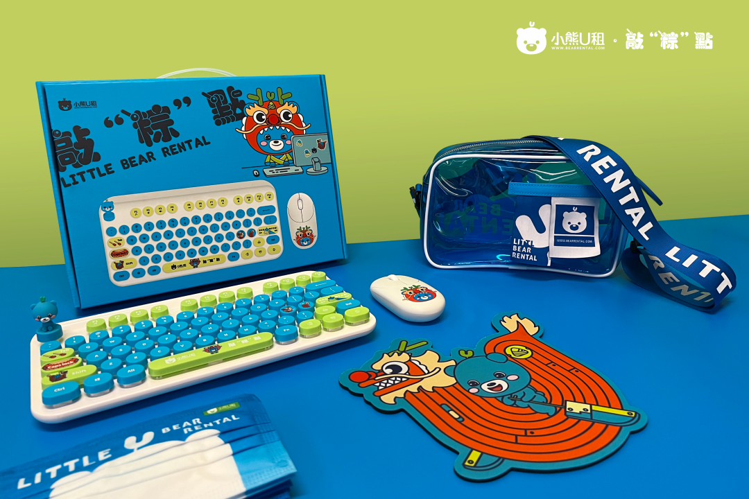 今年小熊U租的「敲‘粽’点」端午礼盒,将敲键盘的动作与粽子元素结合,童趣感满分!键盘以蓝+绿两大明亮的配色为主,上面随处可见的龙舟、粽子元素以及同样创意的鼠标和鼠标垫,让端午的节日氛围感更加浓厚。