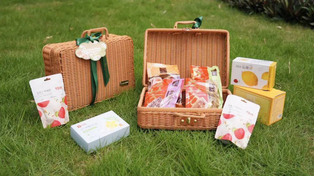 礼盒选取可循环利用的手工编织藤篮,并附上苹果片、桃酥、绿豆糕、柠檬干等健康绿色小食以及端午节重要的粽子,一个箱子装下来,算是把野餐之行的小零食都给承包了。