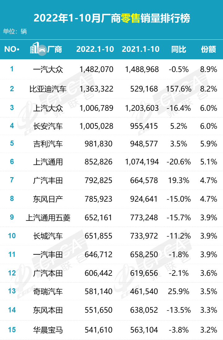 不出所料,一汽大众仍是1-10月厂商销量榜里的,这家车企在今年前十个月一共卖出去了148.2万辆新车,在新车市场里的销售份额占比也是达到了高的8.9%,这实属让人感到有些惊讶。