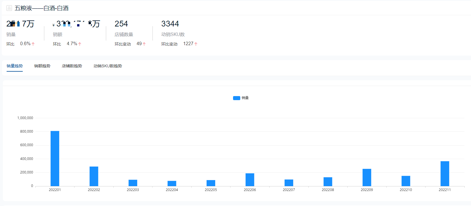 根据鲸参谋数据统计,2022年京东平台白酒的年度总销量超3500万件,同比去年增长5.6%;此外,该平台白酒今年的年度销额累计超225亿元。同时,在天猫平台上,2022.4至2022.11,该时期白酒的销量累计超1300万件,销售额累计超59亿元。
