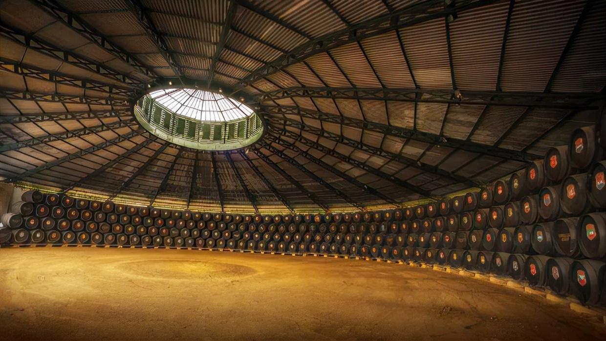 建筑里酒桶沿着圆墙堆起四层,每只桶上都有着不同国旗的浮雕,正中间则是Gonzalez Byass的字样,这些是用来代表进口他们家产品的。