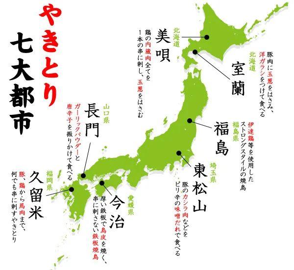 在日本全国有很多地区都发展着独具风格的烧鸟文化。从“烧鸟店铺数量(与人口比)”以及“是否被确立为当地特色美食”等方面来看,有很多可以被称为“烧鸟之城”的地区。