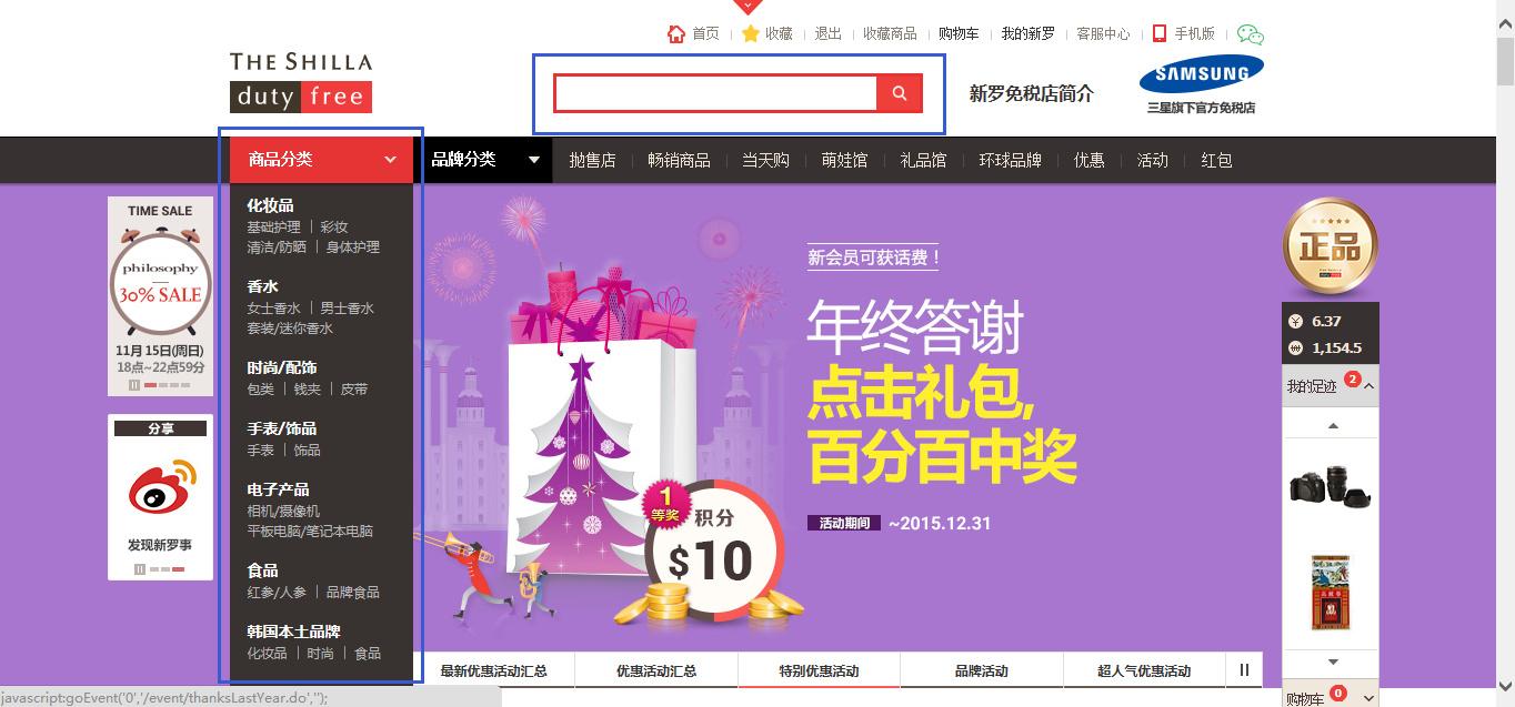 经营商品 包括国际精品、化妆品、香水、手表、珠宝、箱包、太阳镜、保健食品、皮具、紫水晶、工艺品、泡菜等韩国特产。