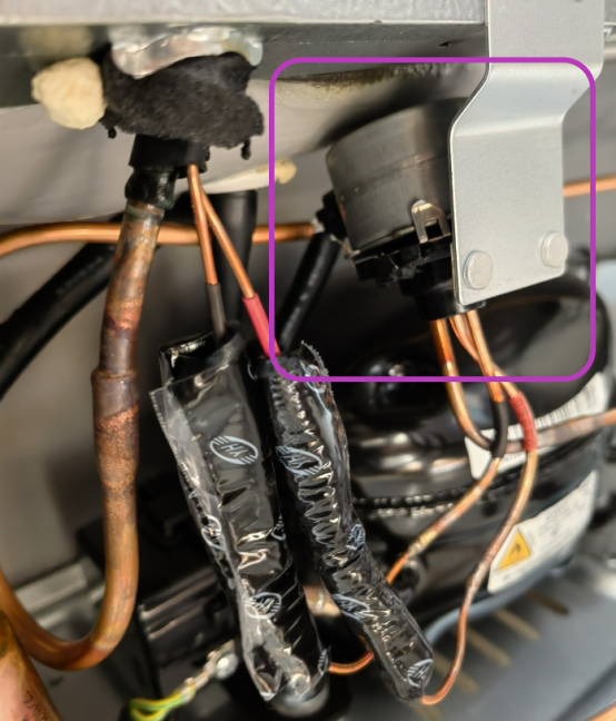 再来看看美的495,拆开冰箱后盖可以看到在干燥过滤器后有一个二位三通电磁阀(下图中紫色方块圈出的部件)。